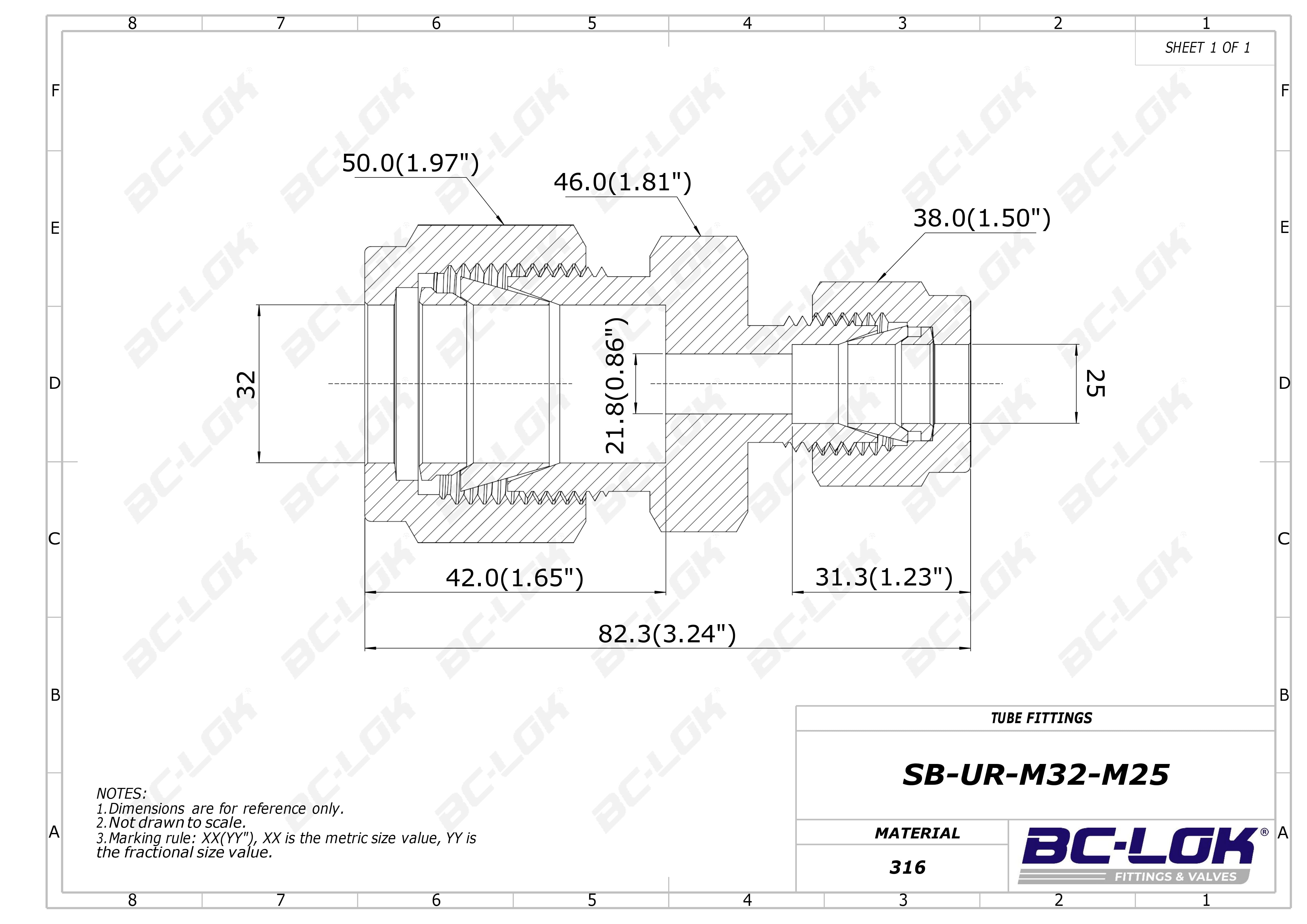 {Fitting type} of stainless steel 316SS, Metric 32 x Metric 25